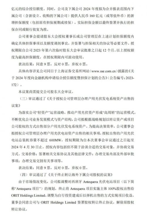 根据公告,为提高决策效率,公司董事会拟授权公司管理层办理户用光伏电站资产出售的相关事项,授权出售的户用光伏电站总装机容量不超过600MW,授权期限为自本次董事会审议通过之日起至2024年4月30日止。