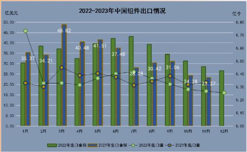 组件方面:2023年1-11月中国组件(已装在组件内或组装成块的光电池)出口量合计为3.96亿个,11月中国组件出口量为0.34亿个,环比上月增加5.06%,同比去年增加24.84%。