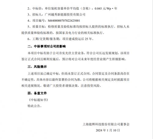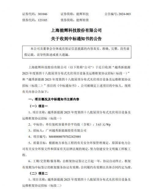 1月10日,能辉科技公告,公司于近日收到“越秀新能源2023年度第四十八批屋顶分布式光伏项目设备及运维框架协议招标(标段一)”和“越秀新能源2023年度第四十八批屋顶分布式光伏项目设备及运维框架协议招标(标段二)”项目的《中标通知书》,公司被确定上述项目的中标人。
