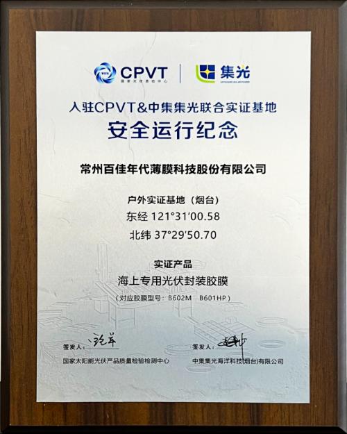 封装材料作为提升组件可靠性的重要一环,百佳年代深知户外实证测试对技术提升的重要性,积极联合国家太阳能光伏产品质量检验检测中心(以下简称CPVT)搭建全系列产品的全应用场景实证基地,密切监测实证数据,不断优化配方结构,积极为合作伙伴提供更加稳定、可靠的产品解决方案。前不久的“海上光伏系统高质量发展论坛暨CPVT&中集集光共建海上光伏实证基地揭牌启动仪式”上,百佳年代作为首批入驻CPVT&中集集光海上实证基地的企业,其推出的海上专用封装解决方案获颁“海上户外实证安全运行证书”,为海上光伏产品可靠性升级助力!