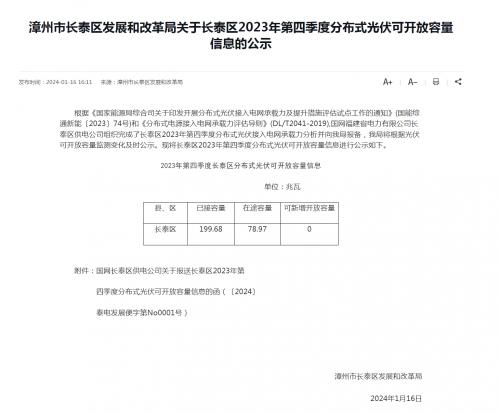 1月16日,福建省漳州市长泰区发展和改革局关于长泰区2023年第四季度分布式光伏可开放容量信息的公示。