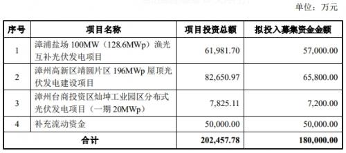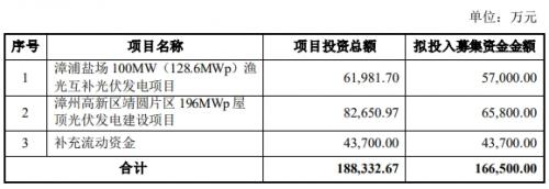 其中,5.7亿元拟用于漳浦盐场100MW(128.6MWp)渔光互补光伏发电项目、6.58亿元拟用于漳州高新区靖圆片区196MWp屋顶光伏发电建设项目、0.72亿元拟用于漳州台商投资区灿坤工业园区分布式光伏发电项目(一期20MWp)、5亿元拟用于补充流动资金。