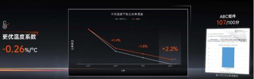 光伏组件在日常环境中也难免经历四季变换和昼夜温度交替。在雨雪风霜和酷暑暴晒下,组件温度的上下波动都将使真实发电能力偏离标称功率,而距离25℃标准测试环境温度越大,其组件的功耗损失越大。而目前ABC凭借高开压等其他技术优势,成功将普通产品-0.3%/℃的功率温度系数降到了-0.26%/℃——可别小看了这0.04%的“微弱”提升,考虑到组件运行环境温差动辄在零度以下或是零上七八十度,相较于25℃的标准组件测试环境,即便只是30℃的温度偏离(如55℃),0.04%的差异就能带来额外1.2%的发电优势。更何况,ABC开创性的电池结构带来了突破性的高温抑制技术,能有效抑制组件运行温度升高,相对更低的运行温度就意味着更低的功率衰减损失。初始功率高、运行温度还低、功率温度系数损耗还更优,真正做到全方位无死角地领先;