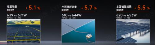在水面漂浮场景,双面ABC组件综合功率较TOPCON同口径下高出34W,功率增益约5.7 %;