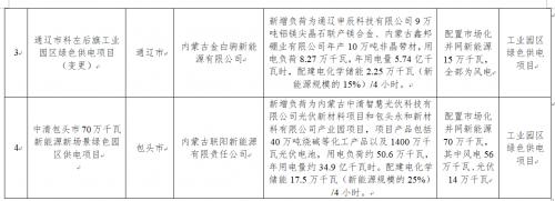 (三)通辽市科左后旗工业园区绿色供电项目。本项目为变更项目,新增负荷为通辽申辰科技有限公司9万吨铝镁尖晶石联产镁合金、内蒙古鑫邦硼业有限公司年产10万吨非晶带材,用电负荷8.27万千瓦,年用电量5.74亿千瓦时。配置市场化并网新能源15万千瓦,全部为风电,配建电化学储能2.25万千瓦(新能源规模的15%)/4小时。