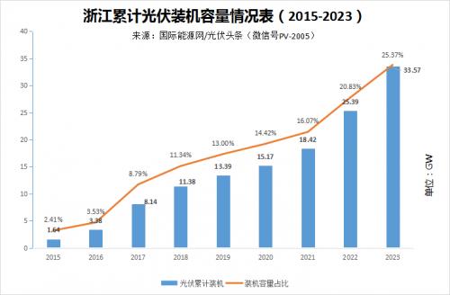 根据最新数据显示,2023年浙江累计光伏装机达到33.57GW,占比高达25.37%。这个数值意味着,浙江约四分之一的电力装机为光伏装机。