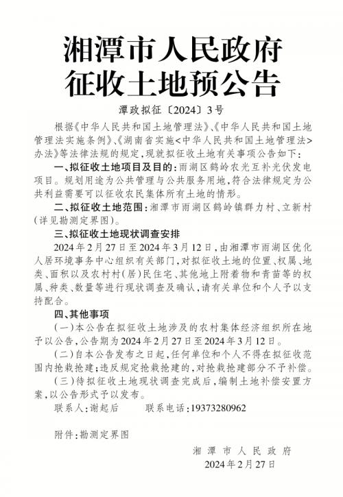 2月28日,湘潭市人民政府发布征收土地预公告。