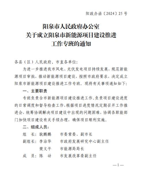 3月12日,山西阳泉市政府发布《阳泉市人民政府办公室关于成立阳泉市新能源项目建设推进工作专班的通知》。文件指出,为进一步推进阳泉市风电、光伏发电项目持续发展,规范新能源项目审批,推动新能源项目建设,按照市政府要求,决定成立阳泉市新能源项目建设推进工作专班。专班负责全市新能源项目建设推进工作。负责项目建设进度的日常调度和督导检查工作,根据项目进度情况定期召开工作推进会,统筹协调解决项目建设中出现的问题困难,协调各职能部门加快项目建设有关手续办理,确保项目顺利实施。
