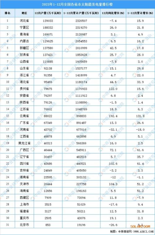 2023年全国太阳能发电量前十省市分别是河北省、宁夏区、青海省、内蒙古、新疆区、甘肃省、山西省、山东省、浙江省、湖北省。其中,2023年河北省太阳能发电量排名第一,累计太阳能发电量为2320507万千瓦时(232.05亿千瓦时)。