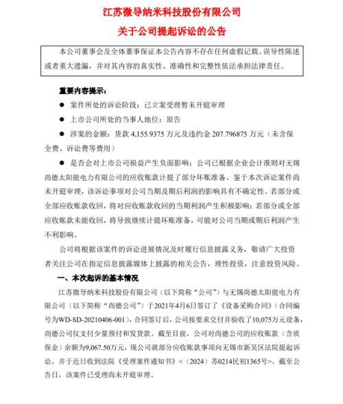 3月18日晚,微导纳米发布公告宣布,起诉无锡尚德太阳能电力有限公司。其原因在于,2021年4月6日,江苏微导纳米科技股份有限公司与无锡尚德太阳能电力有限公司签订了《设备采购合同》(合同编号为WD-SD-20210406-001),合同签订后,微导纳米按要求交付并验收了10075万元设备,尚德公司仅支付少量预付和发货款。截至目前,微导纳米对尚德公司的应收账款(含质保金)余额为9067.50万元。
