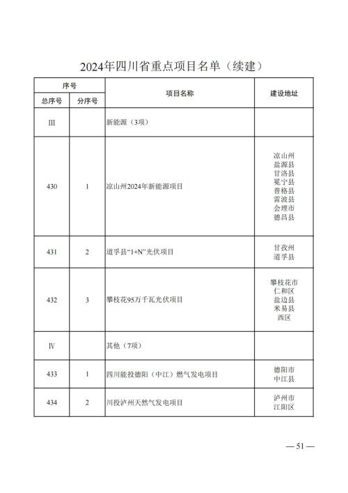 2024年四川省重点项目名单中续建项目共504项,新开工项目共计196项。其中,涉及1个风电项目,7个光伏项目