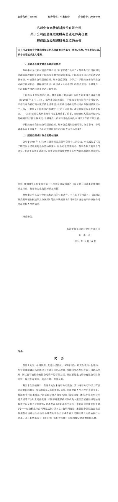 3月29日,中来股份发布关于公司副总经理兼财务总监退休离任暨聘任副总经理兼财务总监的公告。