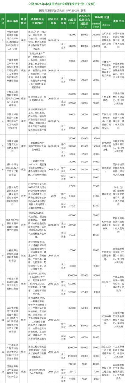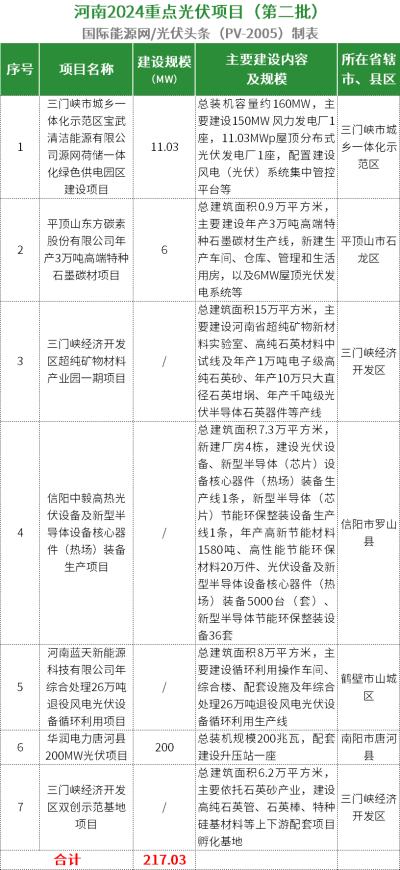 3月13日,河南省人民政府公布2024年河南省第二批重点项目名单。根据公告,2024年第二批省重点建设项目764个,总投资约1.8万亿元,年度计划投资约5566亿元。2024年第二批省重点项目建设名单中共涉及7个光伏项目,涵盖源网荷储一体化、屋顶光伏发电系统、高纯石英材料、光伏设备、光伏电站等。
