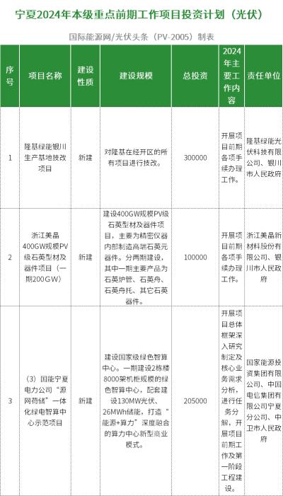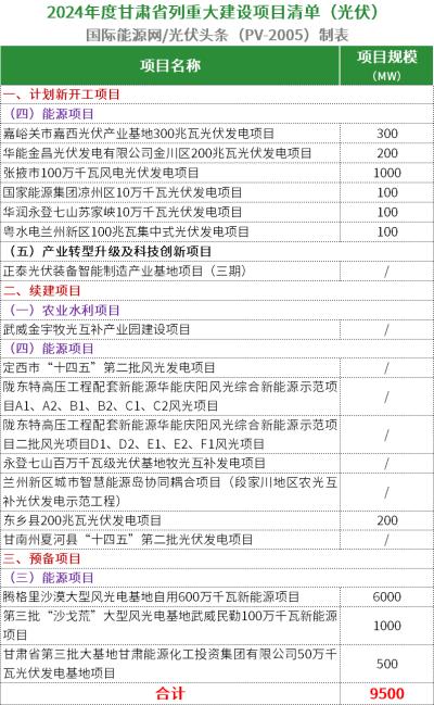 3月14日,甘肃省发改委2024年度省列重大建设项目清单印发,共300个项目。根据清单,其中涉及光伏项目18个(光伏电站项目16个+光伏产业链项目2个),明确光伏项目规模为9500MW。