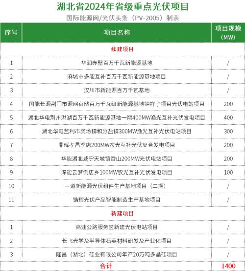 2月27日,湖北省发改委印发2024年省级重点项目清单。根据项目清单,涉及光伏项目14个(光伏电站项目10个+光伏产业链项目4个),其中续建项目11个,新建项目3个,明确光伏项目规模为1400MW。此外,4个光伏产业链项目涉及多晶硅、光伏组件、石英材料等。