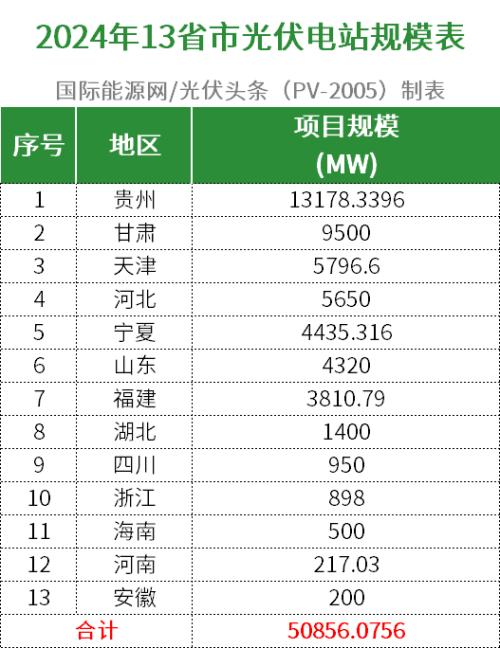 其中,贵州以13178.3396MW排名第一;甘肃以9500MW排名第二,天津则以5796.6MW位列第三。此外,河北、宁夏、山东、福建、湖北5地规模均超过1GW。