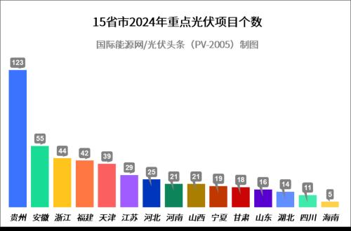 据统计,目前,15省市发布的2024年重点项目名单中共有482个光伏项目。其中,被列入2024年重点项目名单光伏项目数量最多的省份是贵州,达到了123个;其次是安徽和浙江,分别为55个和44个。
