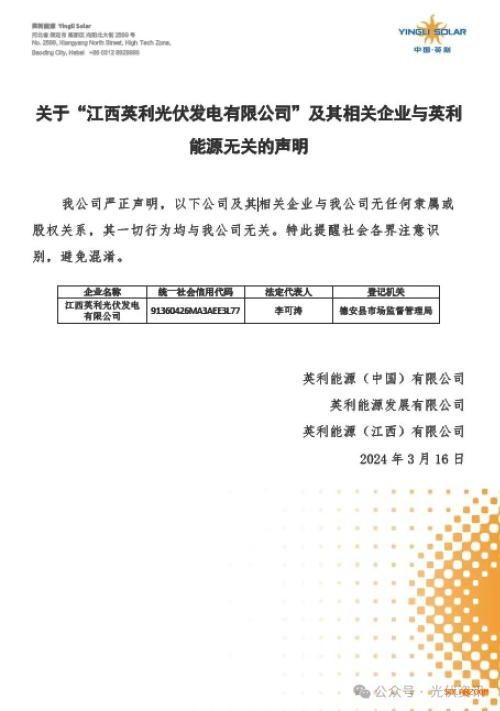 今年3月15日消费者权益日,英利能源曾发布公告澄清与江西英利光伏无关。