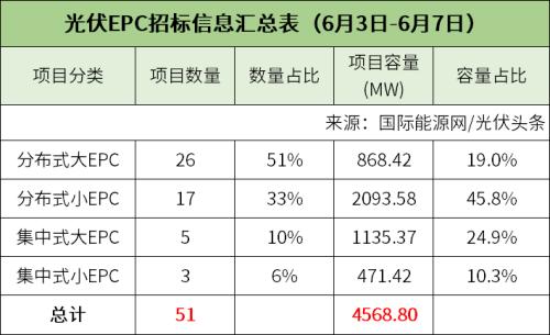 从本周招标项目类别来看,分布式光伏项目有43个,集中式光伏项目有8个,大EPC项目有31个,小EPC项目有20个。