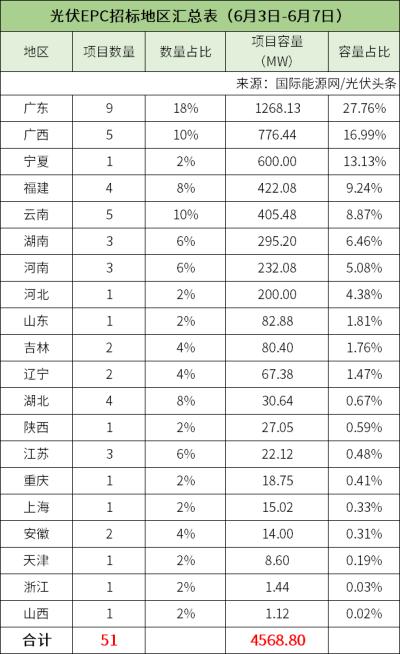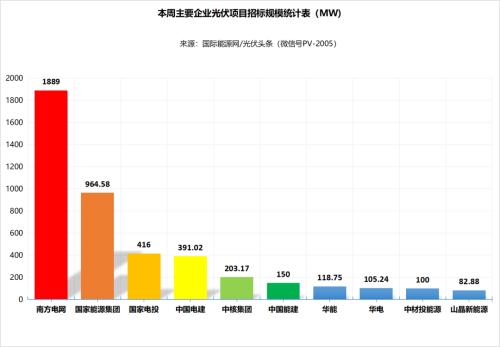 本周南方电网、国家能源集团、国家电投、中国电建、中核集团、中国能建等企业发布了51个光伏招标项目,装机规模合计4568.80MW。