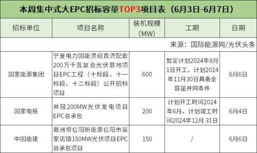 集中式大EPC项目有5个,其中招标容量最大项目为国家能源集团宁夏电力国能灵绍直流配套200万千瓦复合光伏基地项目EPC工程(十标段、十一标段、十二标段)公开招标项目。本次招标范围为国能灵绍直流配套200万千瓦复合光伏基地项目工程EPC总承包的十标段、十一标段、十二标段,三个标段招标容量总计600MWp(直流侧);承包人工作内容包括但不限于:施工图设计、设备和材料及配品备件购置、设备及电气及控制系统的采购和安装、建筑工程安装工程施工、设备调试、系统接入、联合试运行、技术培训、运行人员培训和验收等。