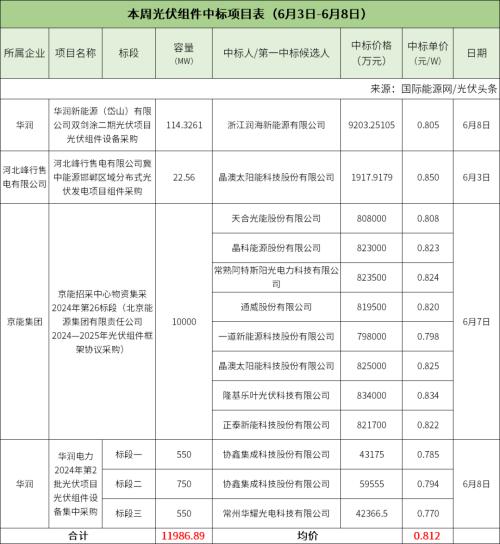 本周华润、京能集团等企业组件中标项目有明确中标价格,合计规模11986.89MW,中标均价为0.812元/W。