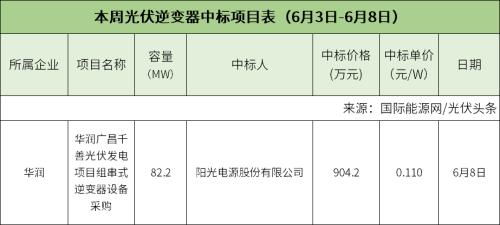 本周华润光伏逆变器中标项目有明确中标价格,规模为82.2MW,中标单价为0.110元/W。