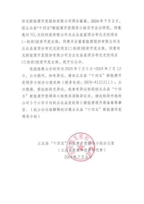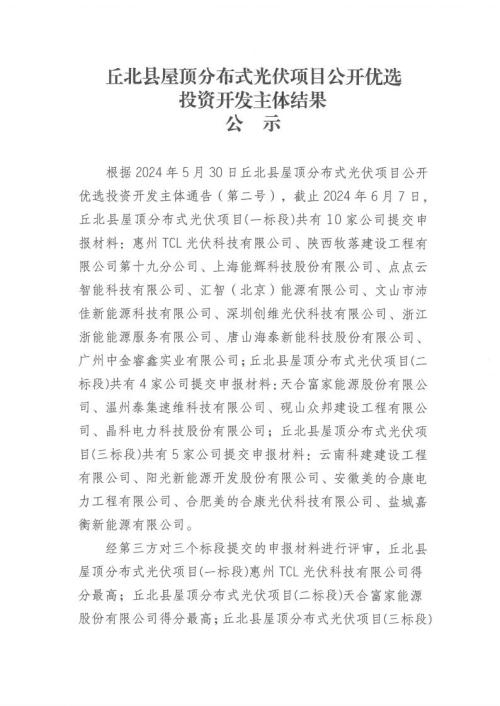 文件显示,惠州TCL光伏科技有限公司为丘北县屋顶分布式光伏项目(一标段)投资开发主体,天合富家能源股份有限公司为丘北县屋顶分布式光伏项目(二标段)投资开发主体,阳光新能源开发股份有限公司为丘北县屋顶分布式光伏项目(三标段)投资开发主体。