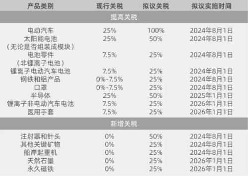 美国贸易代表办公室的新闻稿说,一些关税将于9月27日生效。除了对中国电动汽车加征100%的关税以外,美国还将对中国太阳能电池加征50%的关税,对中国钢铁、铝、电动汽车电池和关键矿物加征25%的关税。