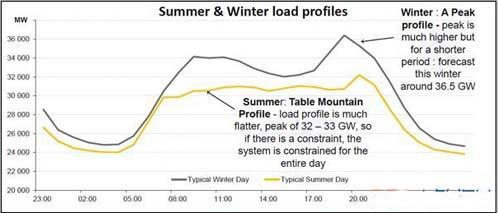 图表1:南非冬季和夏季不同的用电负荷高峰分布情况(Source:Eskom)