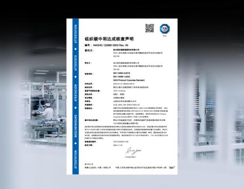 ISO 14068是ISO 14060系列首个碳中和标准。在此次认证中,TÜV南德依据相应标准,对连云港基地进行了组织碳中和核查。核查结果显示,该基地规划并采取了有效减排措施,通过购买国际自愿减排项目碳信用进行足额抵消,实现了碳中和,成为了名副其实的“碳中和工厂”。