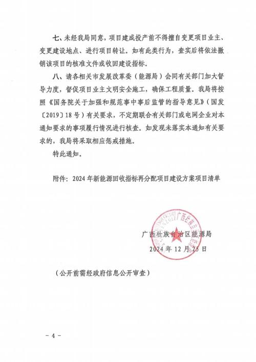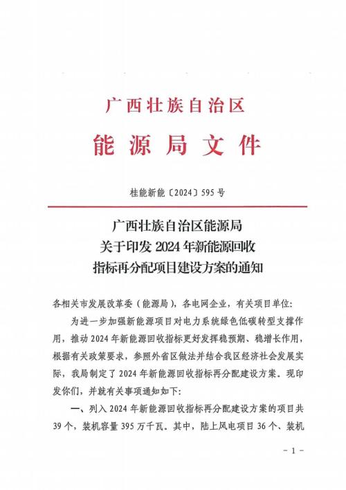 12月26日,广西壮族自治区能源局发布《关于2024年新能源回收指标再分配项目建设方案的通知》。