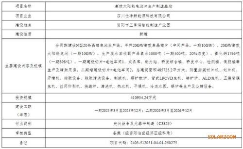 根据公示文件,该项目为四川仕净新能源科技有限公司高效太阳能电池片生产制造基地项目。该项目分两期建设N型20条晶硅电池生产线,年产20GW高效单晶硅片(中间产品,一期10GW)、20GW高效太阳能电池(一期10GW)。项目总投资410934.24万元。建设工期为,一期2025年3月至2025年12月;二期2026年3月至2026年12月。