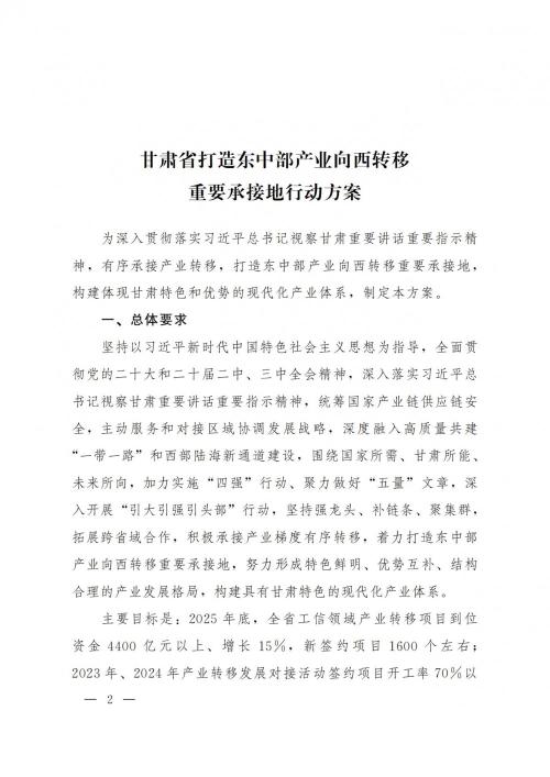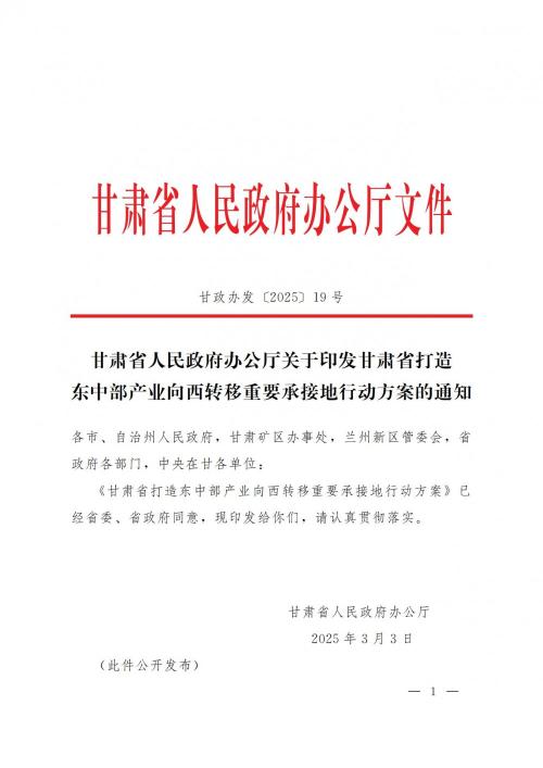 近日,甘肃省人民政府办公厅发布《关于印发甘肃省打造东中部产业向西转移重要承接地行动方案的通知》。