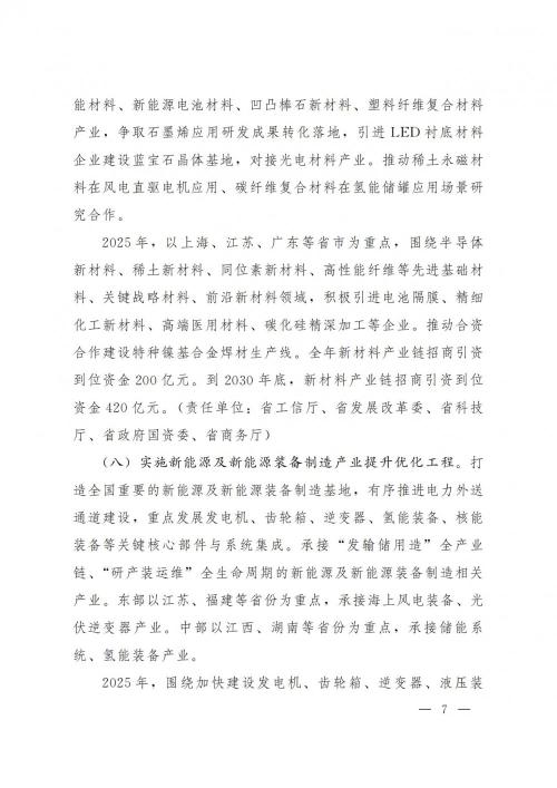 文件提出,实施新能源及新能源装备制造产业提升优化工程。打造全国重要的新能源及新能源装备制造基地,有序推进电力外送通道建设,重点发展发电机、齿轮箱、逆变器、氢能装备、核能装备等关键核心部件与系统集成。承接“发输储用造”全产业链、“研产装运维”全生命周期的新能源及新能源装备制造相关产业。东部以江苏、福建等省份为重点,承接海上风电装备、光伏逆变器产业。中部以江西、湖南等省份为重点,承接储能系统、氢能装备产业。