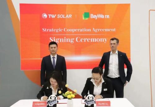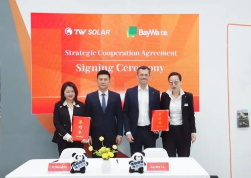 当地时间3月26日,法国里昂BE POSITIVE展会期间,通威与BayWa r.e. Solar Systems SAS(以下简称“BayWa r.e.法国”)携手达成战略合作框架协议。BayWa r.e.法国首席执行官Julien Chirol、通威股份光伏商务部组件营销副总经理薛青松出席见签。BayWa r.e.法国采购总监Duo Neuville、通威股份光伏商务部组件营销法国区域负责人李灵代表双方签署协议。