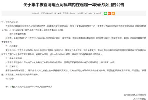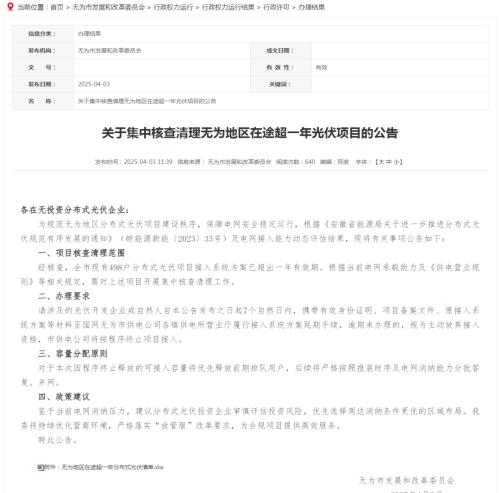 4月3日,安徽省无为市发展和改革委员会发布关于集中核查清理无为地区在途超一年光伏项目的公告。