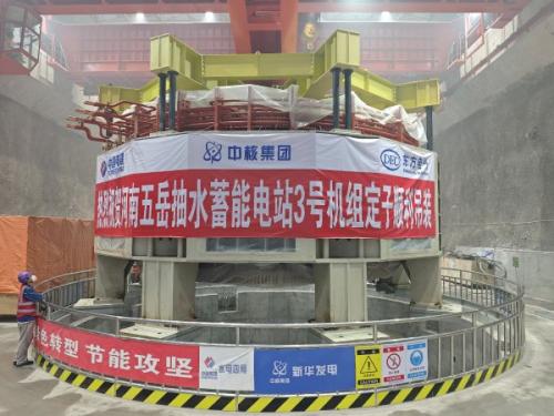 河南五岳抽水蓄能电站3号机组于2023年8月15日座环蜗壳顺利吊装就位;2024年6月8日转轮顺利吊装就位;7月7日,定子顺利吊装就位;9月29日,转子顺利吊装就位,其整体圆柱度0.49毫米,远优于≤1.08毫米的国际标准;2025年3月15日发电方向一次启动成功;3月22日,发电方向并网一次成功;3月24日,水泵方向并网一次成功;3月28日顺利完成各项启动试验;4月9日顺利完成涉网试验。机组从发电方向启动至动态调试试验完成实际用时12天,达到了国内抽水蓄能机组启动调试领先水平。机组各项试验数据均远优于设计和规范要求,其中机组轴瓦温运行良好,机组振动数据优良,上导、下导、水导轴承摆度均在0.05毫米以内,达到国内先进水平。