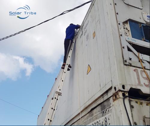 本项目位于坦桑尼亚桑给巴尔岛,由国内工程负责人带领Solar Tribe本地员工操作完成,装机功率6.5KW,直接安装于40尺冷藏集装箱顶部,采取并网模式,实测平均每日可为集装箱提供25度电量,覆盖集装箱白天用电需求。