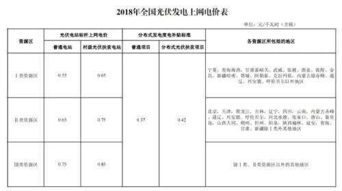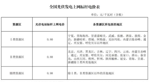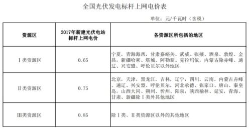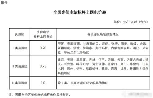 首次提出将全国分为三类太阳能资源区并相应制定光伏电站标杆上网电价,各资源区光伏电站标杆上网电价标准如下: