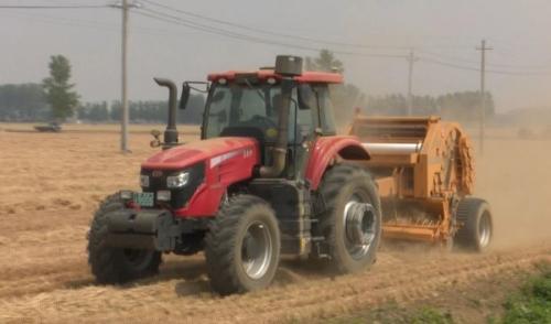 在麦田里,当一块区域收割完毕后,秸秆搂草机和打捆机便迅速接力“上岗”,地里的秸秆被机器“吸入”,经过压实、固定等一系列操作后,一个个大圆形草捆被“吐出”,整齐地“躺”在田里。随后,秸秆夹包机赶来,将一个个圆形草捆逐个夹进运输车内,运往农作物秸秆收储点。整个过程衔接紧密,高效实现了“作物机收+秸秆离田”同步工作。