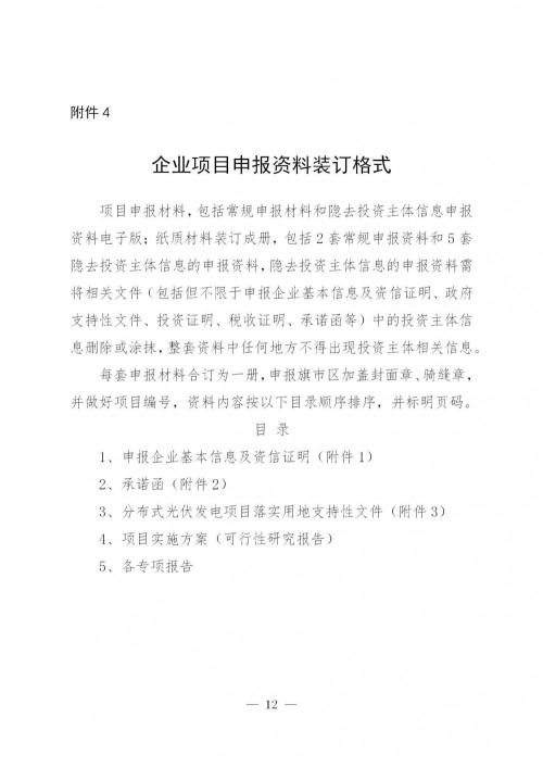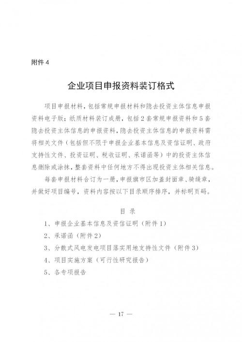 1.项目申报单位按附件要求填写项目汇总表,编制分散式风电、分布式光伏发电项目申报文件,装订成册,每个申报项目需提交2套常规申报资料和5套隐去投资主体信息的申报资料,将电子版材料刻录至光盘。