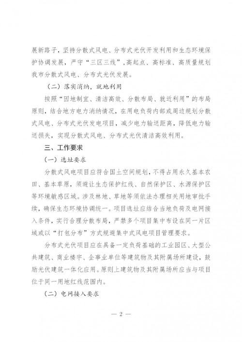 1.分散式风电项目:单个项目容量不超过50兆瓦,需符合国土空间规划,避开永久基本农田、生态保护红线等敏感区域。严禁多个项目集中布设在同一片区域或以“打包分布”方式规避集中式风电项目管理要求。