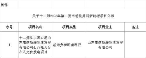 纳入十二师2025年第二批市场化并网新能源项目有1个,为十二师头屯河农场山东高速新疆物流发展有限公司4.77兆瓦分布式光伏发电项目。项目类型为新增负荷配套路径,项目业主为山东高速新疆物流发展有限公司。