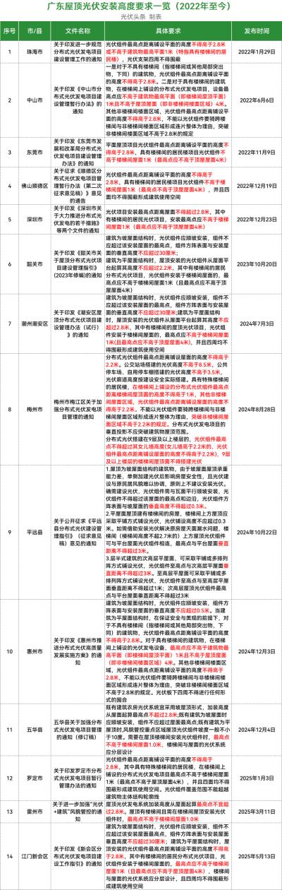 此外,广东珠海市、广东中山市、广东东菀市、广东深圳市、广东潮州潮安区、广东罗定市等均规定光伏项目安装最高点距离屋面不得超过2.8米,有楼梯间的居民分布式光伏项目,光伏组件安装的最高点大多应不高于楼梯间顶平面1米。