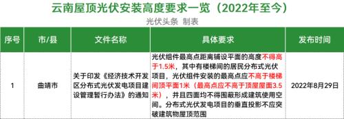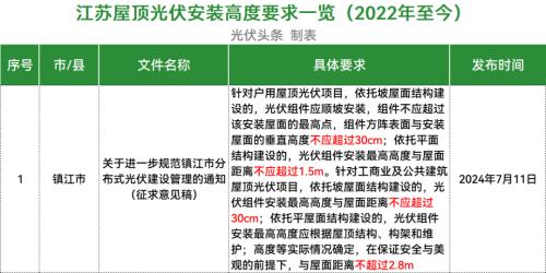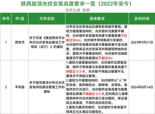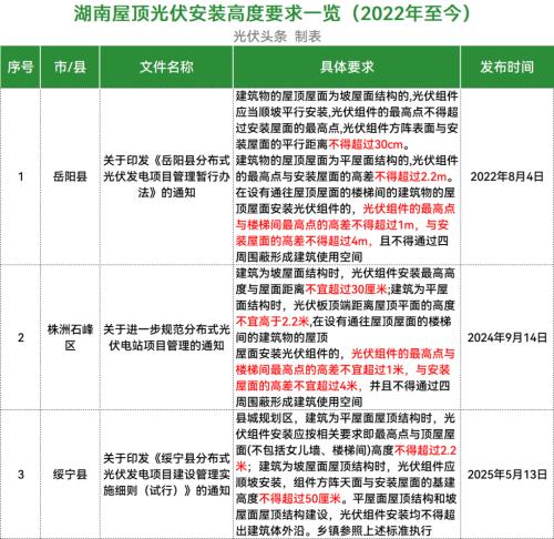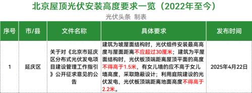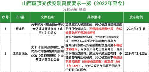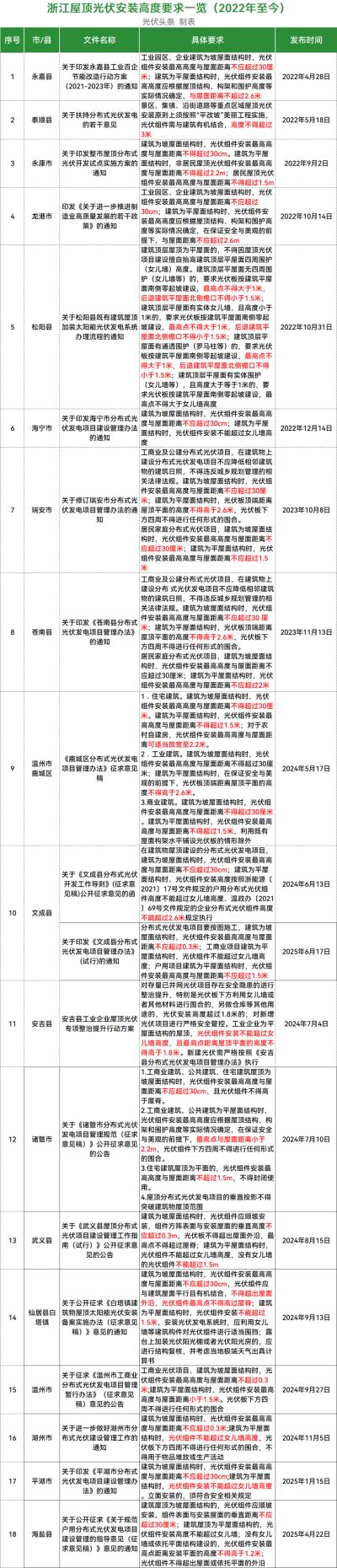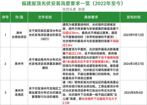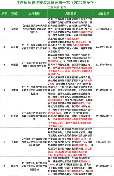 光伏头条统计,2022年至今,安徽芜湖繁昌区、北京延庆区、福建漳州台商投资区、福建泉州市、福建漳州龙海区、广东佛山顺德区、广东珠海市、广东中山市、广东东莞市、广东深圳市、广东韶关市、广东潮州潮安区、广东罗定市、广东梅州市、广东平远县、广东惠州市、广东五华县、广东雷州市、广东江门新会区、广西南宁市、广西岑溪市、广西德保县、广西柳州柳江区、贵州丹寨县、贵州麻江县、湖北宜昌市、湖北通山县、湖北神农架林区、湖南岳阳县、湖南株洲石峰区、湖南绥宁县、江苏镇江市、江西于都县、江西安远县、江西会昌县、江西兴国县、江西全南县、江西彭泽县、江西庐山市、山西稷山县、山西太原晋源区、陕西西安市、陕西平利县、云南曲靖市、浙江松阳县、浙江永嘉县、浙江泰顺县、浙江苍南县、浙江瑞安市、浙江永康市、浙江龙港市、浙江海宁市、浙江温州鹿城区、浙江文成县、浙江诸暨市、浙江安吉县、浙江武义县、浙江仙居县白塔镇、浙江温州市、浙江湖州市、浙江平湖市、浙江海盐县62地出台相关政策,对屋顶光伏安装高度要求进行规范。