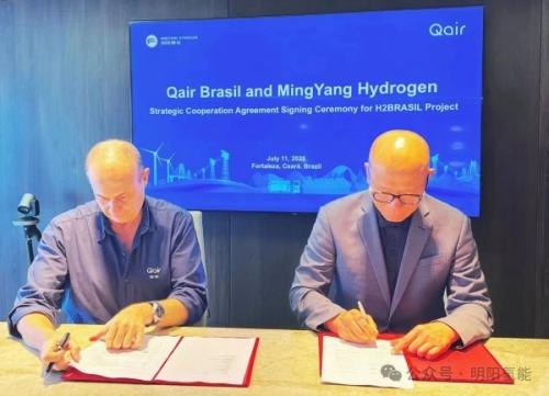 2025年7月11日,北京明阳氢能科技有限公司(以下简称“明阳氢能”)与Qair Brasil于巴西Ceará州的Fortaleza正式签署制氢装备合作协议,明阳氢能将作为氢能设备和解决方案供应商,执行Qair Brasil在Fortaleza的H2BRASIL项目20MW成套制氢装备的设备合作和运维任务。