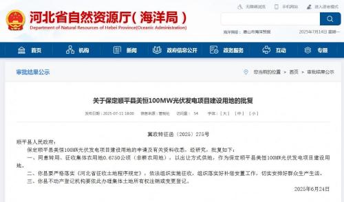 7月11日,河北省自然资源厅发布关于保定顺平县美恒100MW光伏发电项目建设用地的批复。