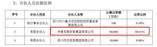 值得注意的是,兴丹基金属于国资基金。从其股权结构来看,丹棱发展控股集团有限公司作为有限合伙人,出资比例达到89.91%,而丹棱发展控股集团有限公司是丹棱县国资局100%控股的国有企业,具有国资背景。