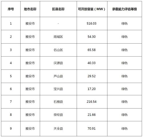 根据公示信息,四川雅安市2025年三季度分布式光伏可开放容量为516.03MW,9个区县承载能力评估等级全部为绿色。